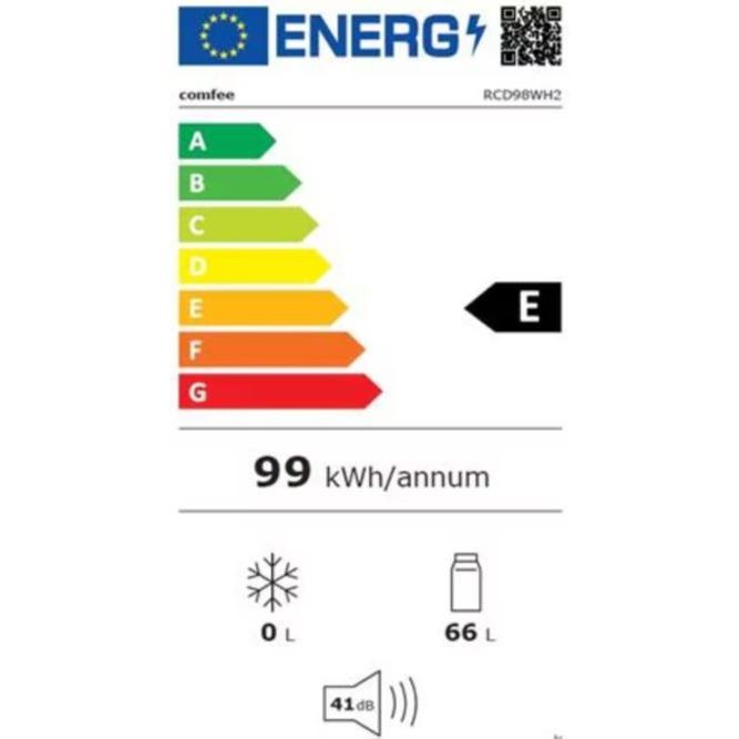 Il frigorifero minibar COMFEE RCD98WH2 è un modello da sottotavolo, a libera installazione, di colore bianco.